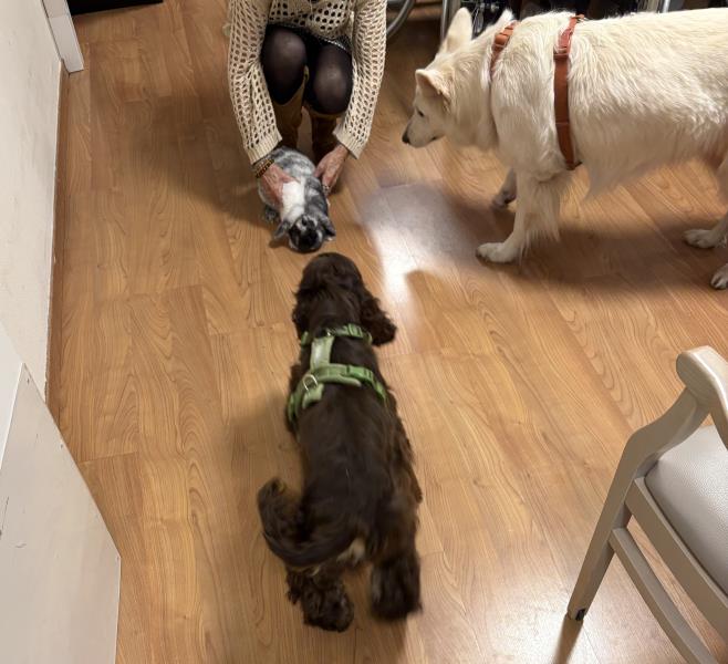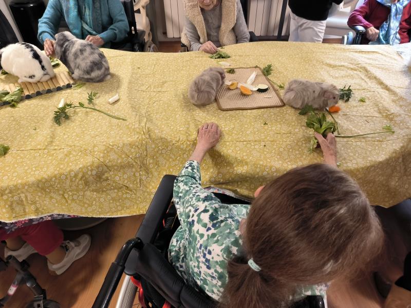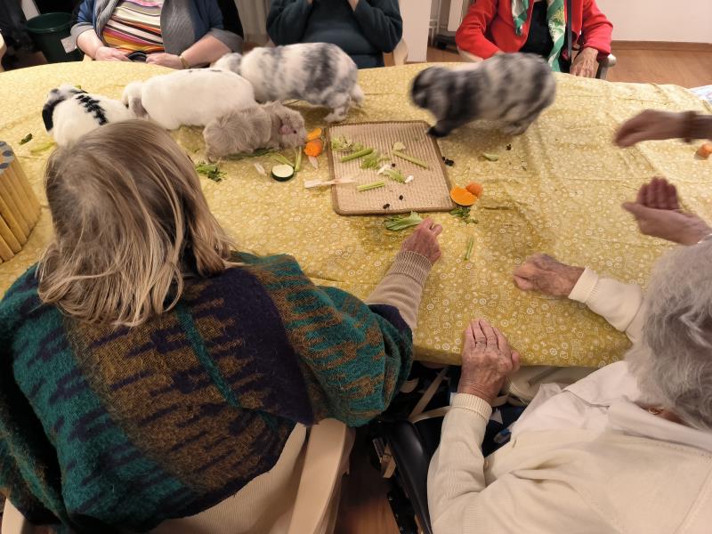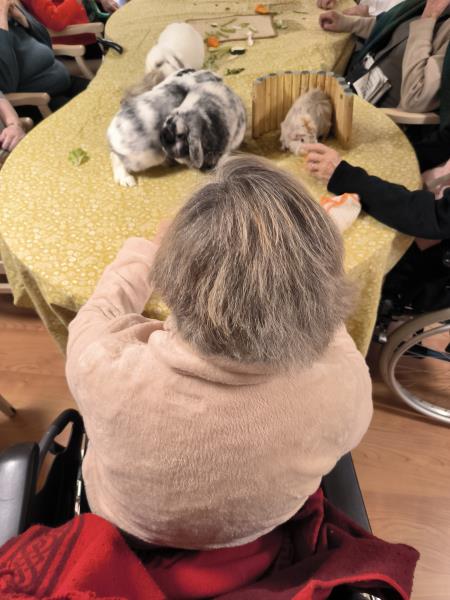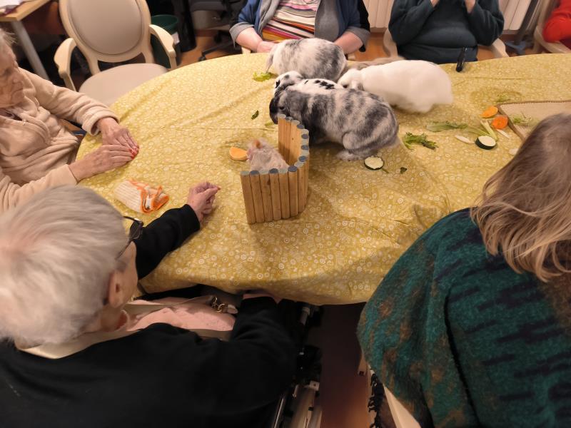 Dès l’arrivée des animaux, un climat de calme et de curiosité s’est installé dans la salle d’animation. Les résidents ont été invités à observer, caresser et interagir avec les lapins, dont la douceur du pelage et la nature apaisante ont rapidement conquis chacun des participants. Certains ont évoqué des souvenirs d’enfance ou de vie à la campagne, favorisant ainsi l’expression des émotions et la communication entre les résidents et l’équipe.