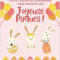 Publiée le 01/04/2024Mesdames Messieurs, Toute l'équipe de la résidence Arpège vous souhaite une Joyeuse Pâques ! 🐣 Nous vous transmettons nos vœux chocolatés pour un Pâques rempli de joie et de doux moments. 🍫 Nous remercions une nouvelle fois, les familles et [...] Lire la suite